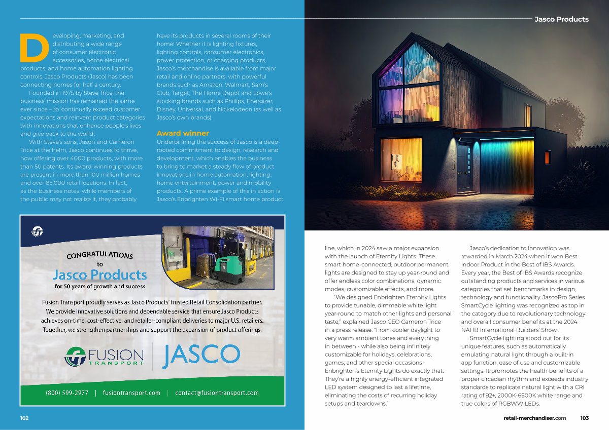 Jasco’ s dedication to innovation was rewarded in March 2024 when it won Best Indoor Product in the Best of IBS Awards. Every year, the Best of IBS Awards recognize outstanding products and services in various categories that set benchmarks in design, technology and functionality. JascoPro Series SmartCycle lighting was recognized as top in the category due to revolutionary technology and overall consumer benefits at the 2024 NAHB International Builders’ Show.