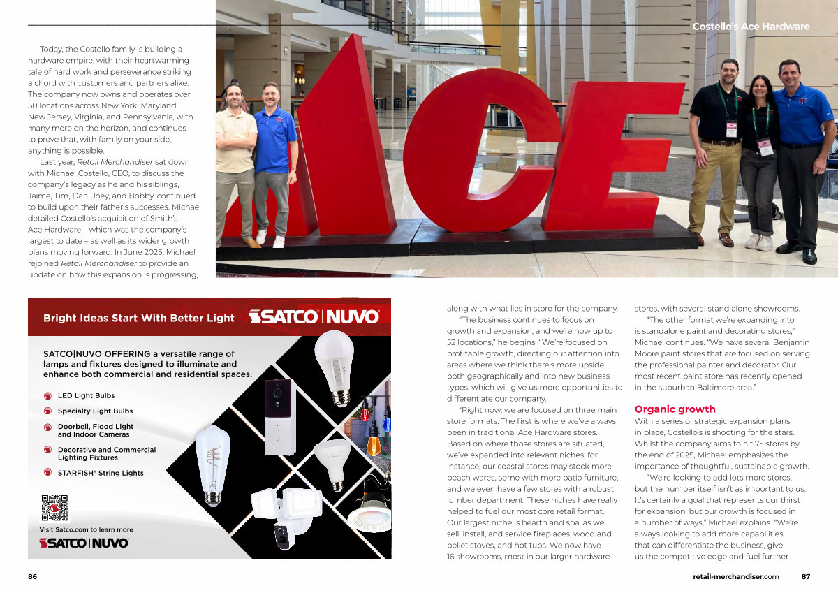 Last year, Retail Merchandiser sat down with Michael Costello, CEO, to discuss the company’ s legacy as he and his siblings, Jaime, Tim, Dan, Joey, and Bobby, continued to build upon their father’ s successes. Michael detailed Costello’ s acquisition of Smith’ s Ace Hardware – which was the company’ s largest to date – as well as its wider growth plans moving forward. In June 2025, Michael rejoined Retail Merchandiser to provide an update on how this expansion is progressing,