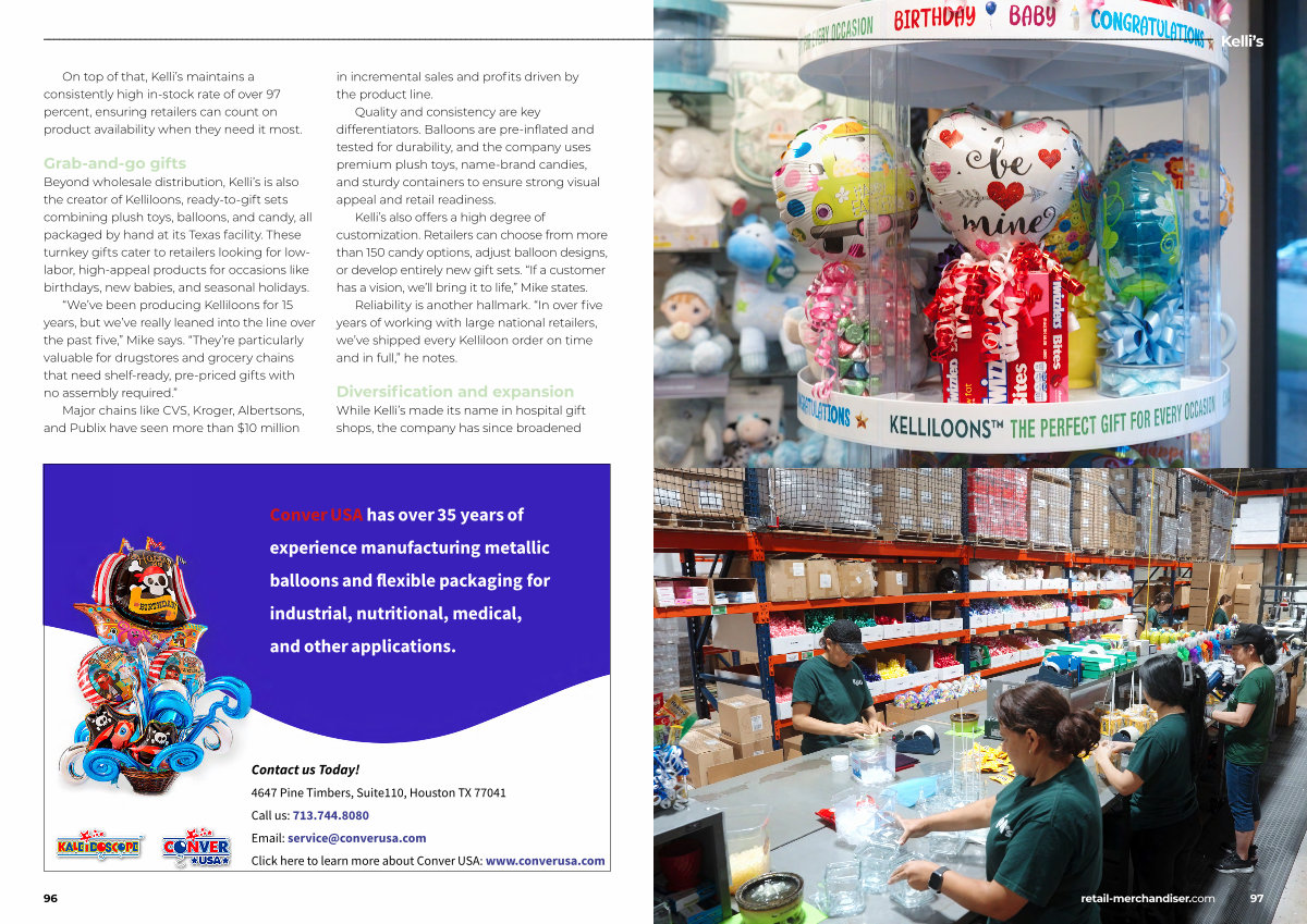 Beyond wholesale distribution, Kelli’ s is also the creator of Kelliloons, ready-to-gift sets combining plush toys, balloons, and candy, all packaged by hand at its Texas facility. These turnkey gifts cater to retailers looking for lowlabor, high-appeal products for occasions like birthdays, new babies, and seasonal holidays.“ We’ ve been producing Kelliloons for 15 years, but we’ ve really leaned into the line over the past five,” Mike says.“ They’ re particularly valuable for drugstores and grocery chains that need shelf-ready, pre-priced gifts with no assembly required.”