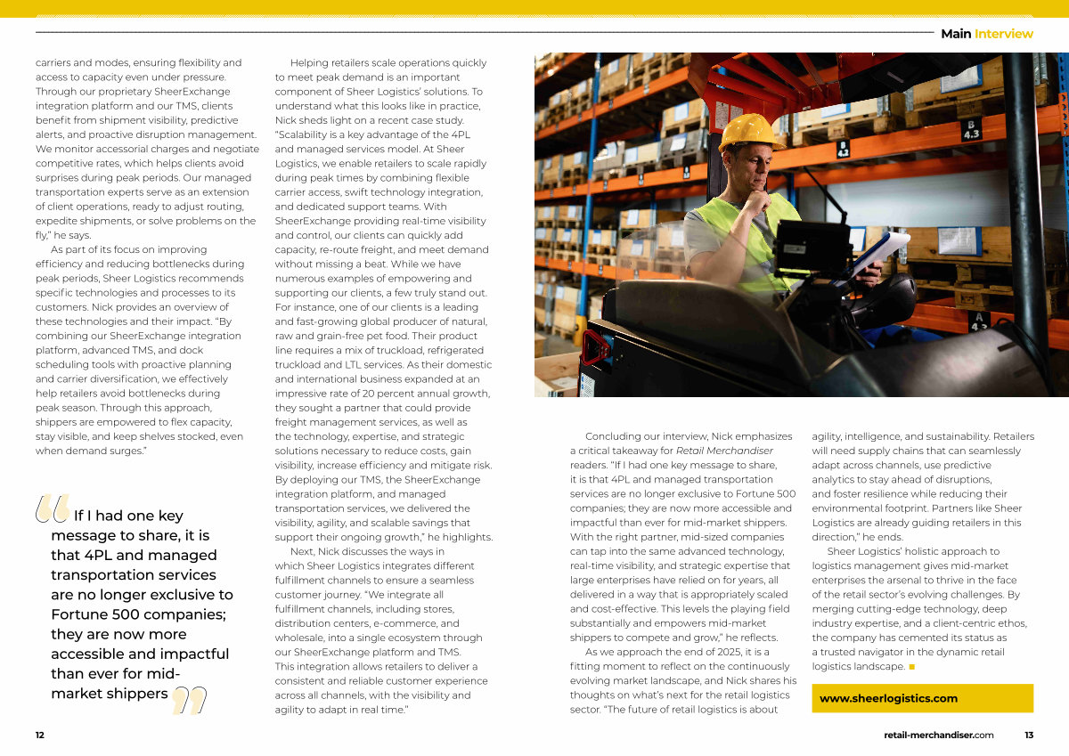 Concluding our interview, Nick emphasizes a critical takeaway for Retail Merchandiser readers.“ If I had one key message to share, it is that 4PL and managed transportation services are no longer exclusive to Fortune 500 companies; they are now more accessible and impactful than ever for mid-market shippers. With the right partner, mid-sized companies can tap into the same advanced technology, real-time visibility, and strategic expertise that large enterprises have relied on for years, all delivered in a way that is appropriately scaled and cost-effective. This levels the playing field substantially and empowers mid-market shippers to compete and grow,” he reflects. As we approach the end of 2025, it is a fitting moment to reflect on the continuously evolving market landscape, and Nick shares his thoughts on what’ s next for the retail logistics sector.“ The future of retail logistics is about agility, intelligence, and sustainability. Retailers will need supply chains that can seamlessly adapt across channels, use predictive analytics to stay ahead of disruptions, and foster resilience while reducing their environmental footprint. Partners like Sheer Logistics are already guiding retailers in this direction,” he ends.