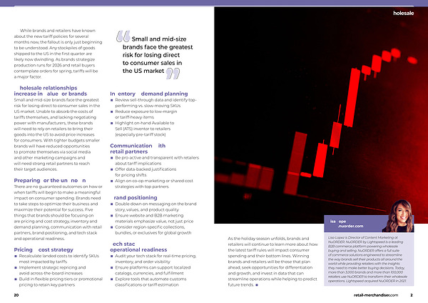 As the holiday season unfolds, brands and retailers will continue to learn more about how the latest tariff rules will impact consumer spending and their bottom lines. Winning brands and retailers will be those that plan ahead, seek opportunities for differentiation and growth, and invest in data that can streamline operations while helping to predict future trends. ■