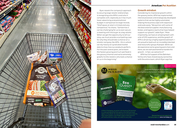 Ryan reveals the company’ s approach to securing large retailer relationships is recognizing who APN is and who it competes with, especially as it has much lower advertising and promotional budget in comparison to larger brands.“ Shelf space at retail is limited and very competitive,” he shares.“ Sometimes it can be challenging for us to even secure a meeting with the buyer at a key retailer. When we get the opportunity to tell our story, we must provide a compelling case for why they should take a chance on a smaller company like APN – this is where we rely heavily on syndicated market data to show how our products perform. For the past several years, we’ ve been the fastest growing premium pet food in the grocery channel and we’ re extremely grateful to the retailers who took a chance on us in the beginning.”