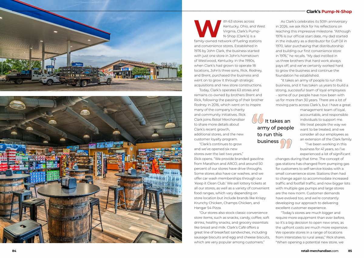 With 63 stores across Kentucky, Ohio, and West Virginia, Clark’ s Pump- N-Shop( Clark’ s) is a family-owned network of fueling stations and convenience stores. Established in 1976 by John Clark, the business started with just one store in John’ s hometown of Westwood, Kentucky. In the 1990s, when Clark’ s had grown to operate 18 locations, John’ s three sons, Rick, Rodney, and Brent, purchased the business and went on to grow it through strategic acquisitions and new store constructions. Today, Clark’ s operates 63 stores and remains co-owned by brothers Brent and Rick, following the passing of their brother Rodney in 2016, which went on to inspire many of the company’ s charity and community initiatives. Rick Clark joins Retail Merchandiser to share more details about Clark’ s recent growth, additional stores, and the new customer loyalty program.